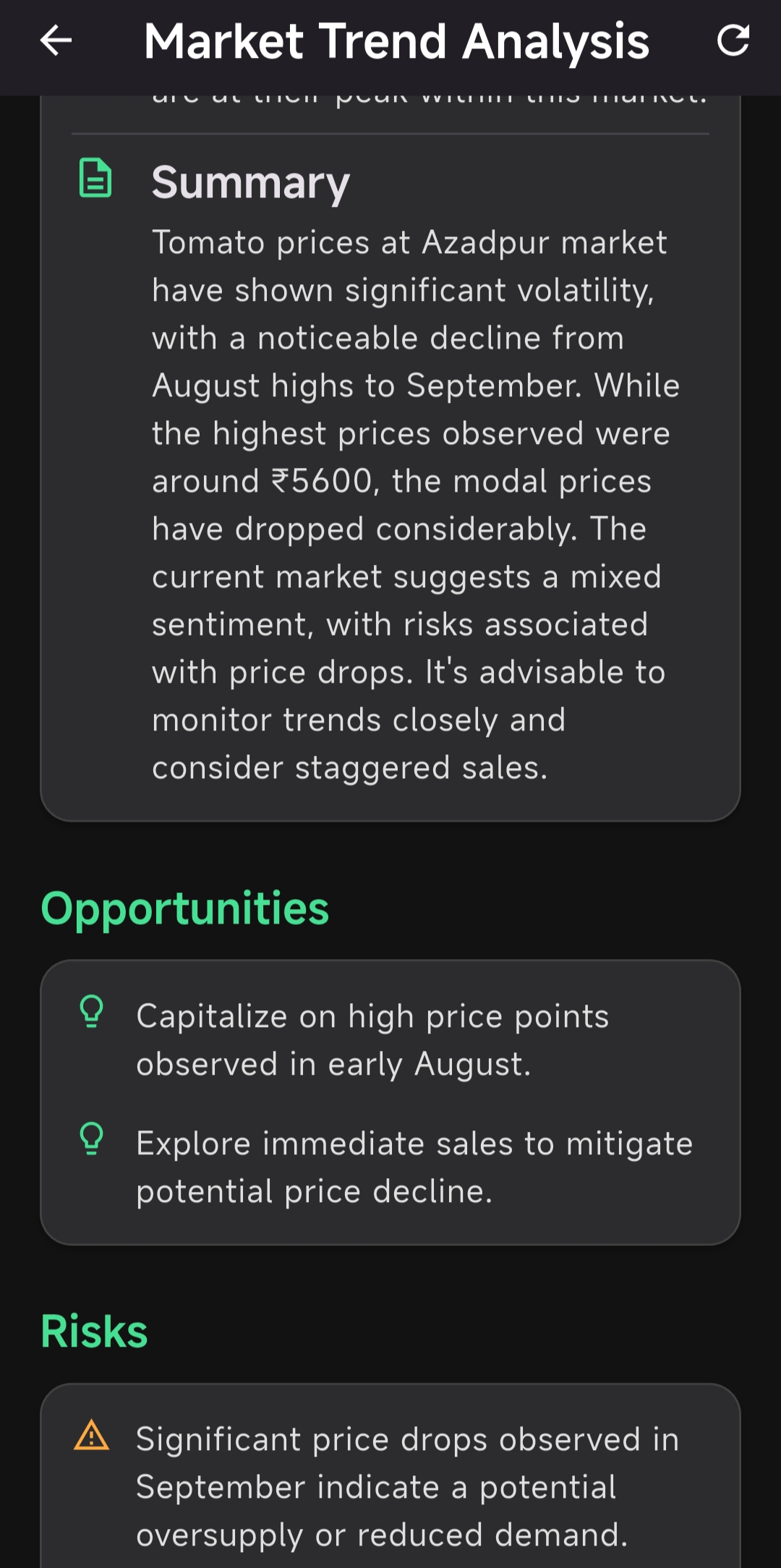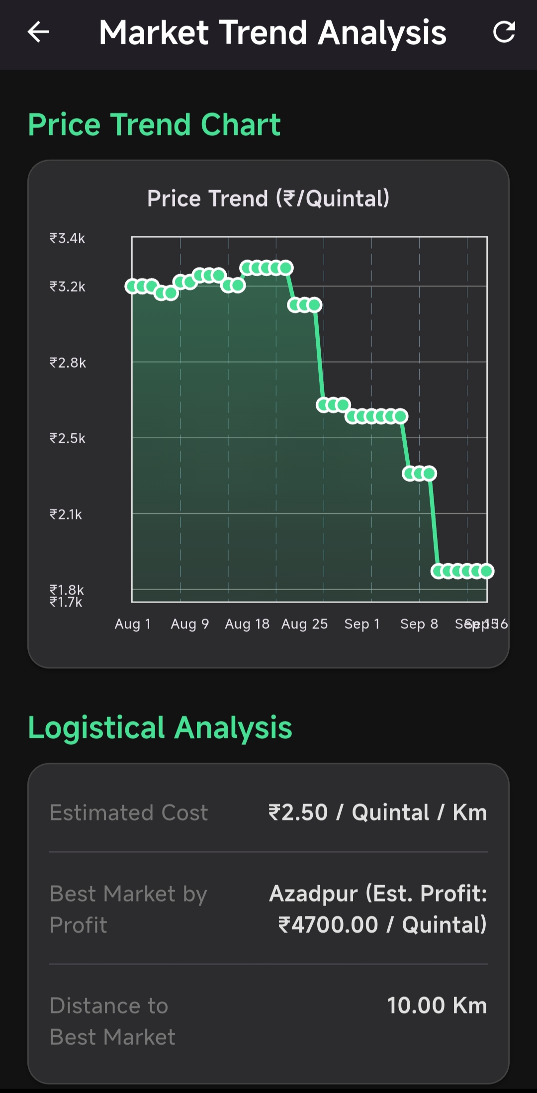 Analyze price trend charts and get logistical analysis to find the best market for your produce. Our AI provides summaries, opportunities, and risks, helping you secure fairer value.