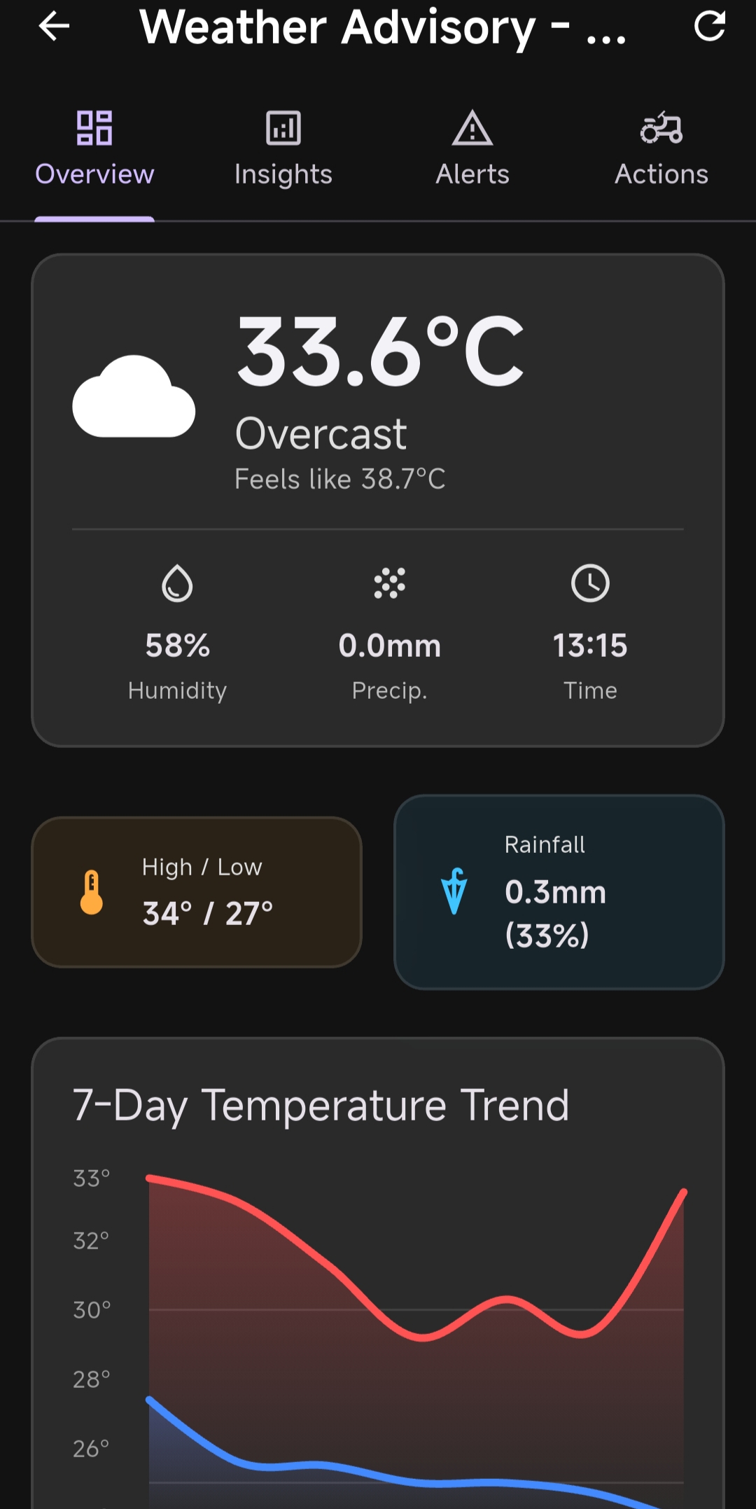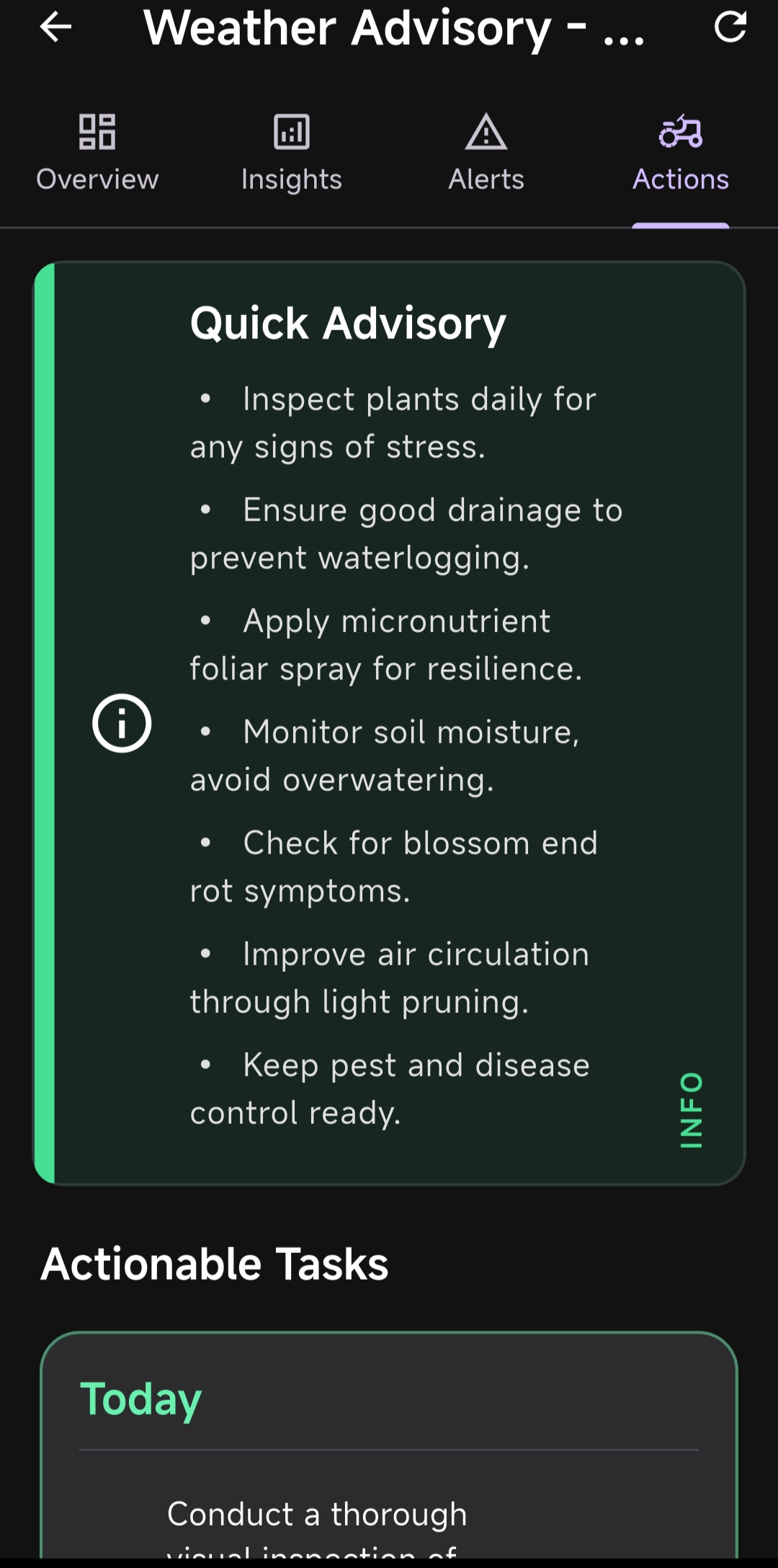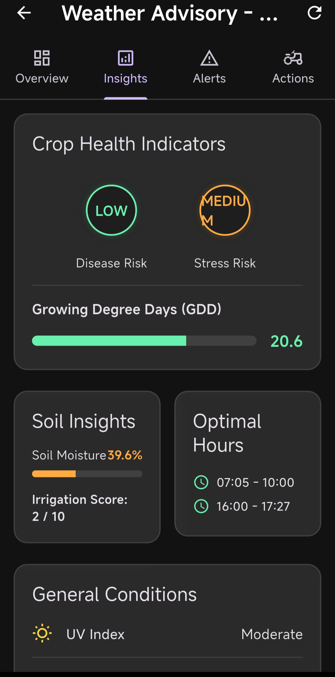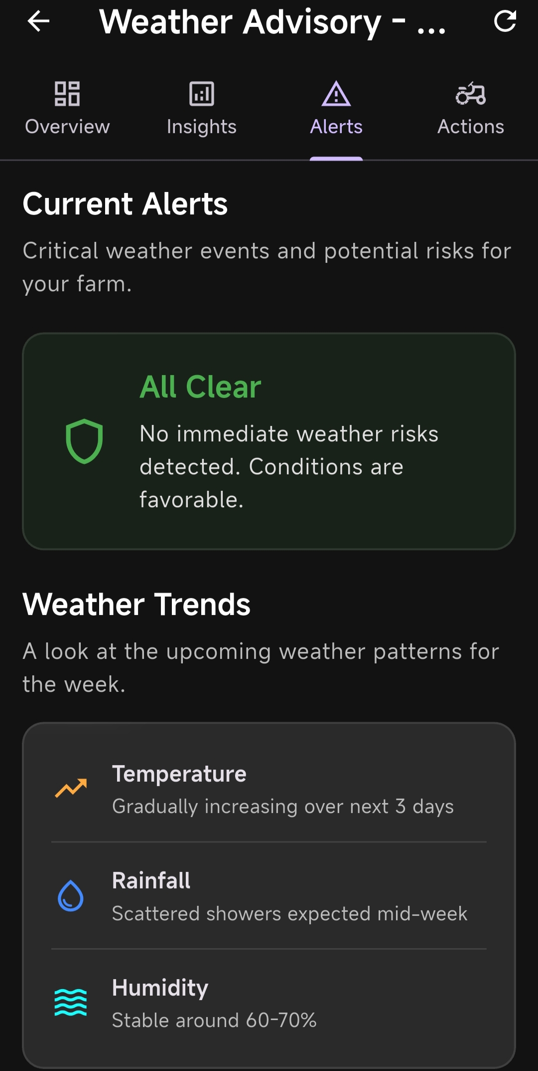 Raw weather data is transformed into practical, daily and weekly action plans tailored to your farm. Get critical alerts, insights on crop health indicators, and optimal irrigation hours.
