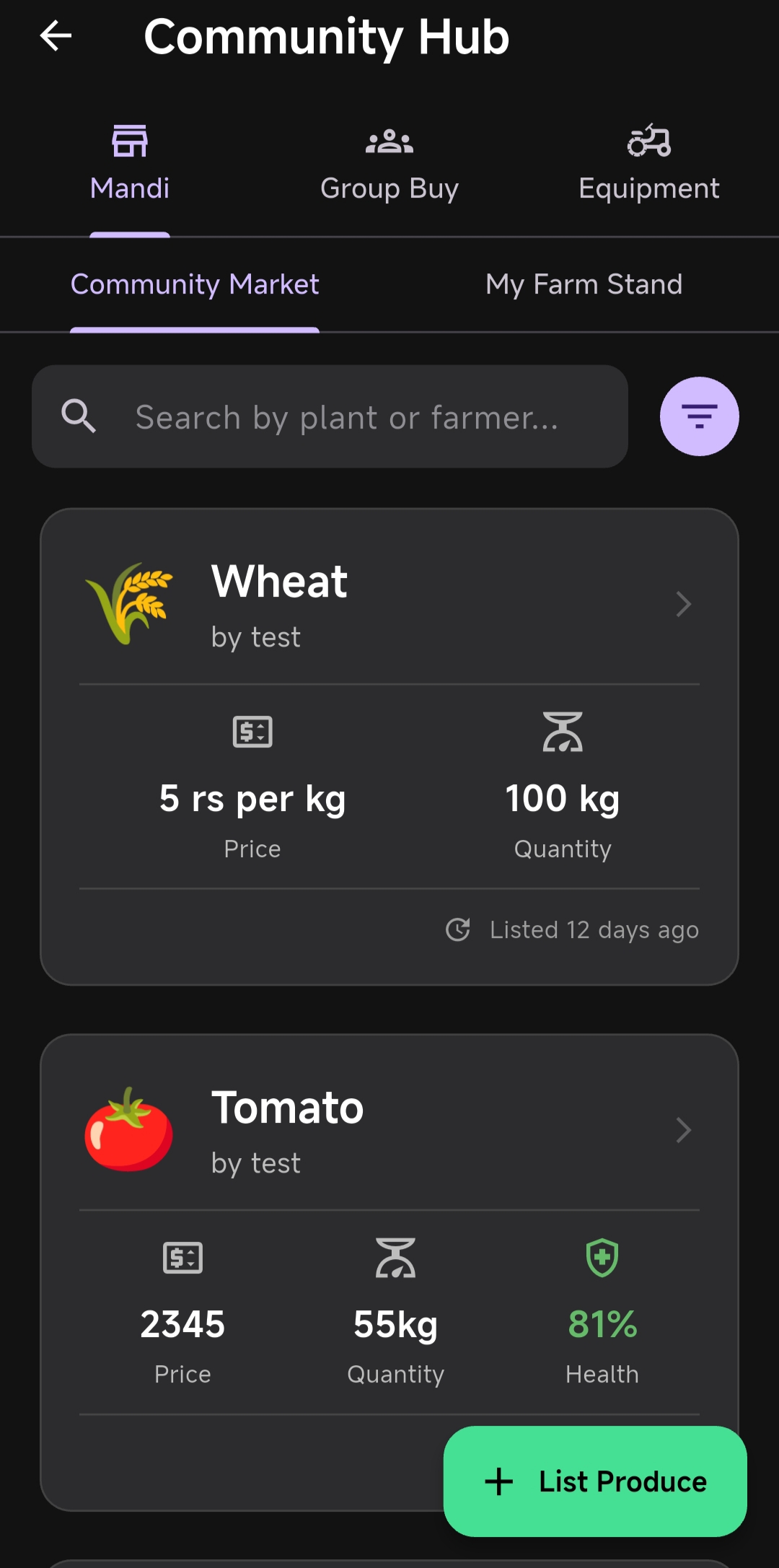 Our Community Hub enables direct selling, group-buying for products, and equipment rentals. This fosters collaboration and strengthens farmer communities, putting control back in your hands.