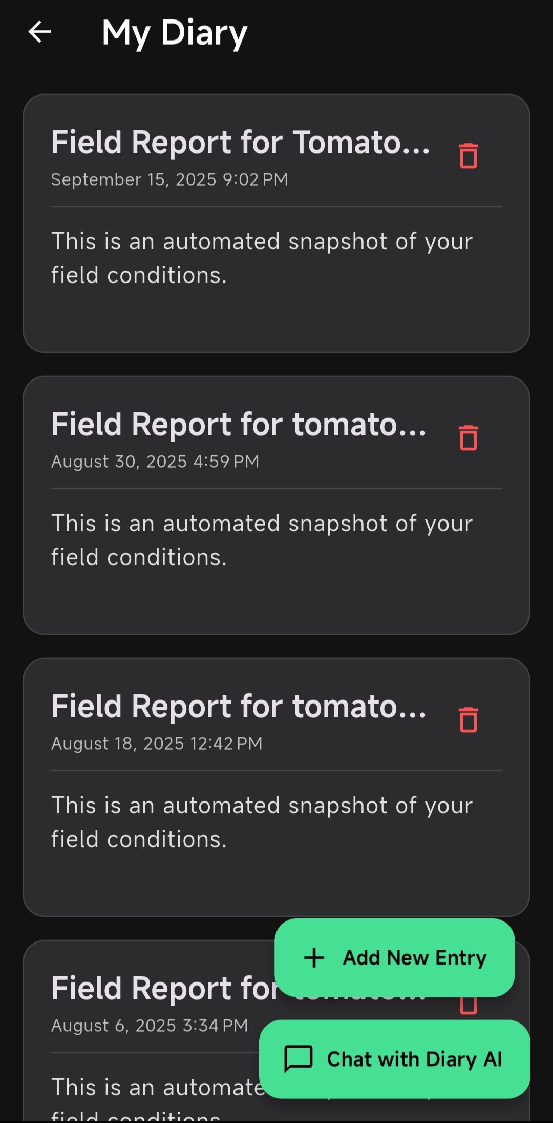 Log images, notes, and crop status with ease. Your diary becomes a smart mentor, allowing you to chat with its AI to get insights from your past data.