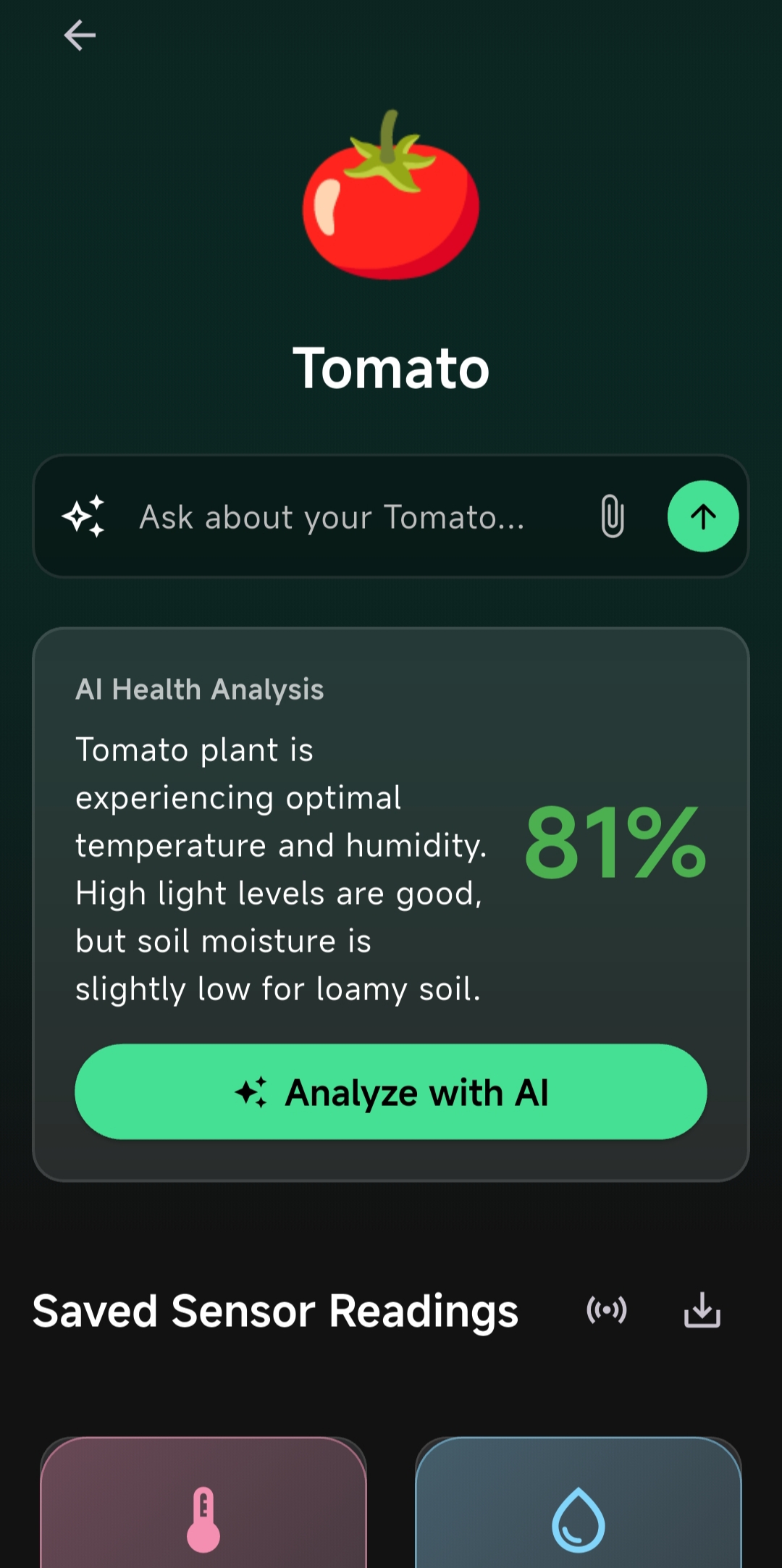 Go beyond a general overview. Every plant you add gets its own dedicated dashboardโor Crop Profileโwith personalized tools, predictions, and a real-time AI health analysis based on sensor and environmental data.