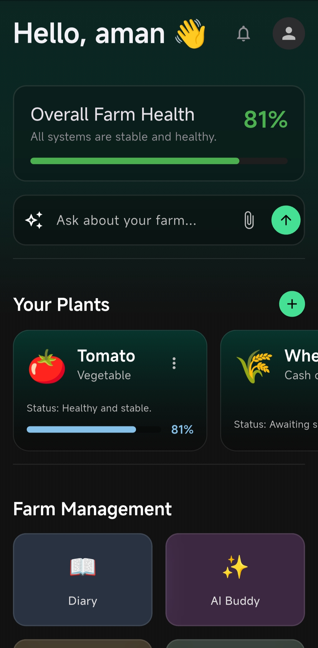 The main dashboard gives you an instant overview of your entire farm's health. From here, you can ask the general AI questions or dive into individual crop profiles for a more detailed analysis.