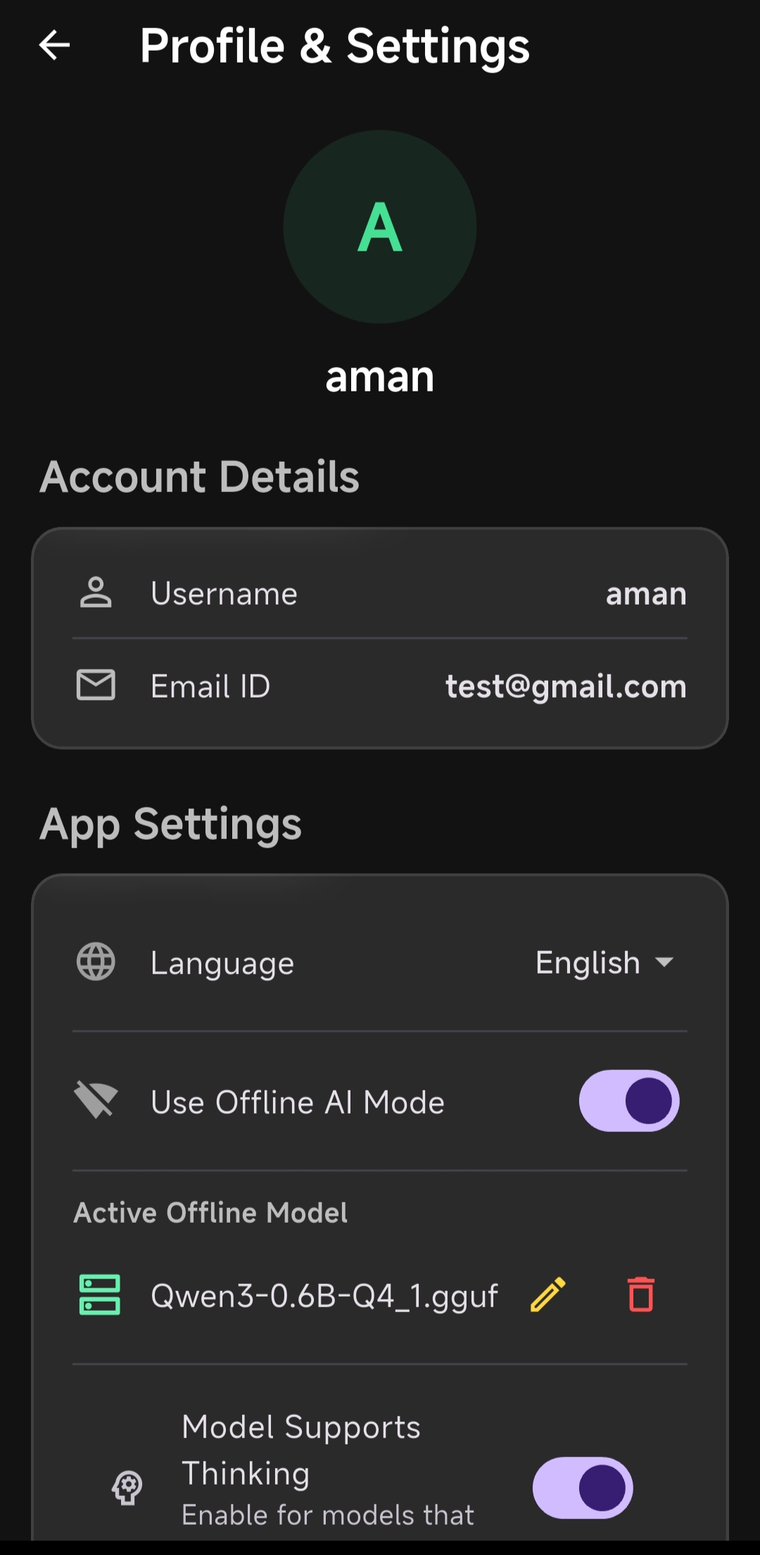 Manage your account details, switch languages, and even select your preferred offline AI model directly from the settings. You have complete control over how the app works for you.